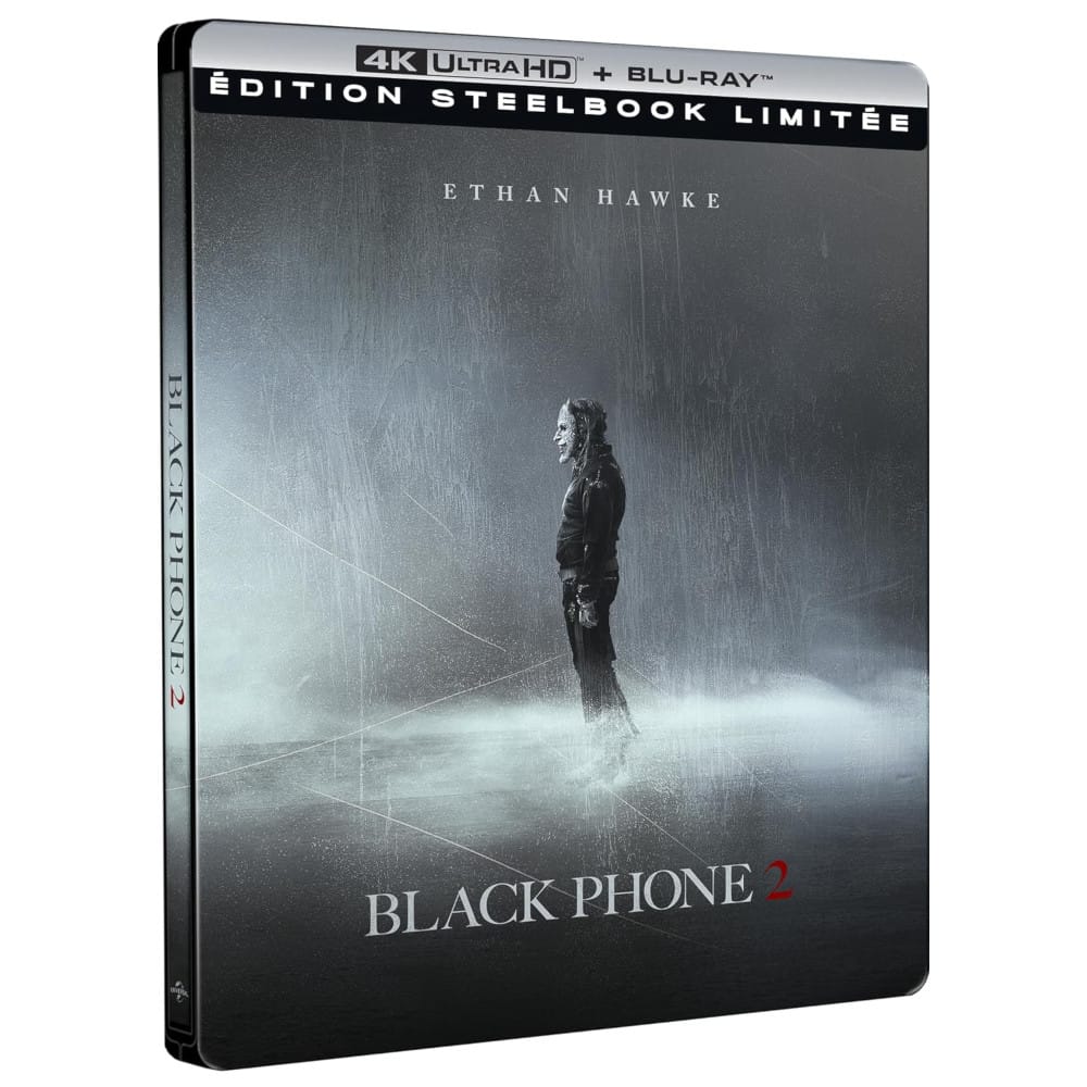 Éditeur : Universal Pictures. Audio VO Dolby Atmos. VF Dolby Digital Plus 7.1. Cette édition limitée en boîtier métal SteelBook réunit le film Black Phone 2 sur deux disques — un Blu-ray 4K UHD et un Blu-ray standard — avec une image en HDR10 et une piste audio Dolby Atmos pour la version originale. Une édition destinée aux amateurs de cinéma de genre et aux collectionneurs des SteelBooks Universal.