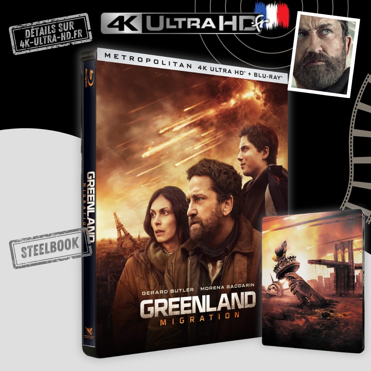Édition Blu-ray 4K Ultra HD SteelBook de Greenland : Migration (2026), suite du film catastrophe avec Gerard Butler. Cette édition comprend le film en 4K UHD et Blu-ray, pour prolonger le récit de survie après l’impact de la comète.