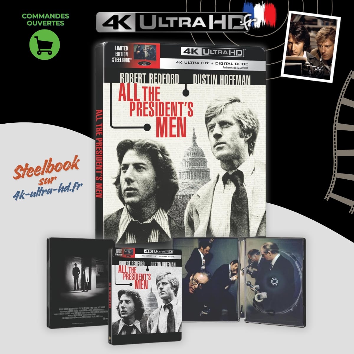 Sorti en 1976, Les Hommes du président (All the President’s Men) est proposé en édition Steelbook 4K Ultra HD avec un Blu-ray 4K et un Blu-ray, pour redécouvrir ce thriller politique emblématique retraçant l’enquête du Watergate menée par deux journalistes du Washington Post.