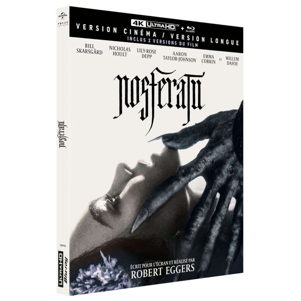 Édition 4K Ultra HD du film Nosferatu (2024) par Universal Pictures, présentée dans un boîtier avec fourreau contenant deux disques (4K UHD + Blu-ray) et de nombreux bonus vidéo. | Universal Pictures