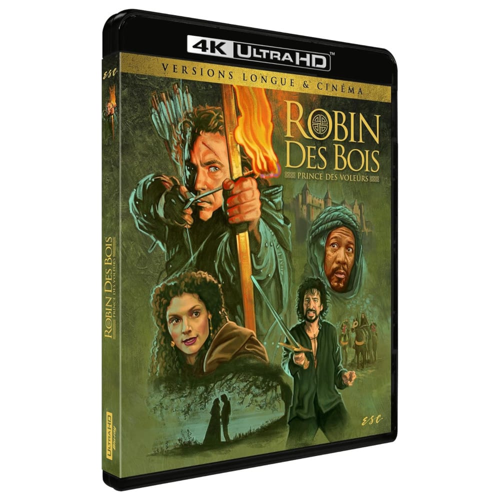 Édition 4K Ultra HD de Robin des Bois, prince des voleurs en Dolby Vision et HDR10, avec pistes audio VO et VF DTS-HD MA 5.1. Inclut le film en versions cinéma et longue sur un disque 4K UHD, accompagné de commentaires audio et d’une bande-annonce.